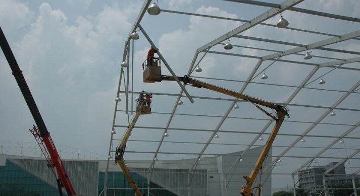 进入篷房搭建现场必须严格遵守现场各项规章制度,对施工人员要做好现场安全教育。安装使用的脚手架,使用前必须认真检查架子有无糟朽现象,有无探头板,施工周围应及时清理障碍物,防止钉子扎脚或其它磕碰工伤事故